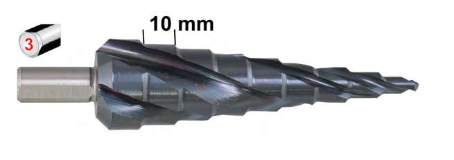 Typ 08048 ‐ Stufenbohrer mit extra großer Stufenhöhe von 10 mm. Type 4217 mit speziellen